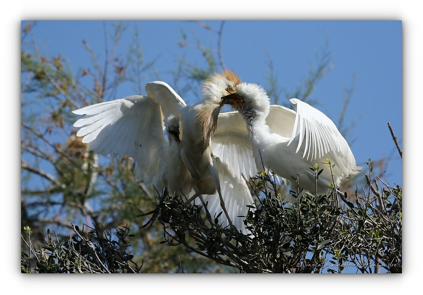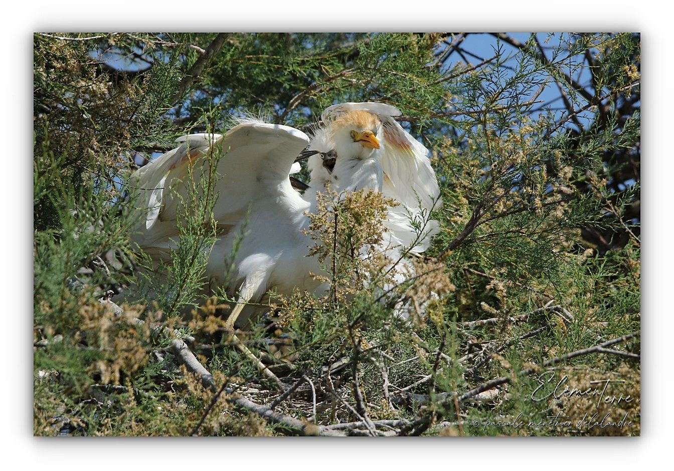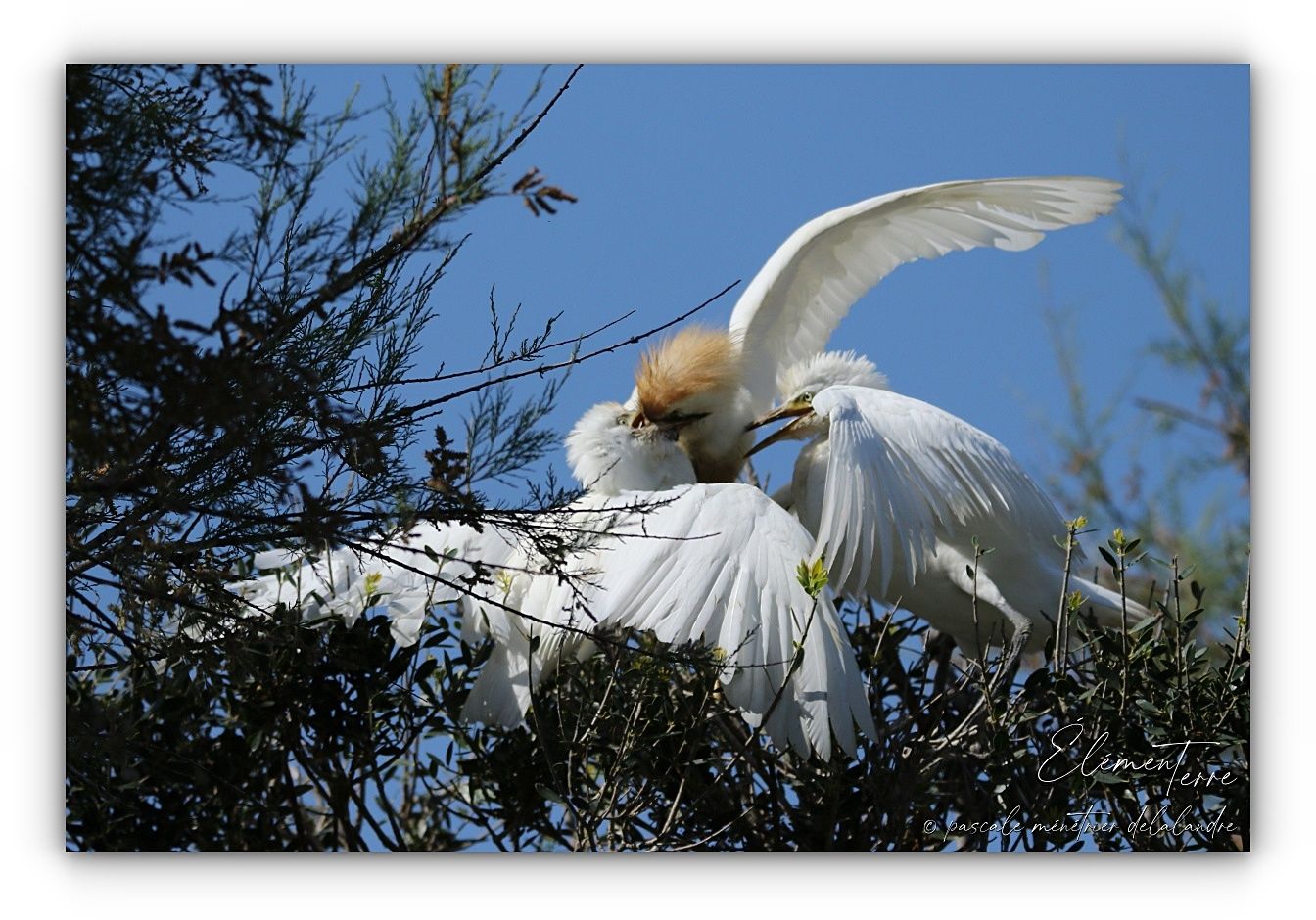 Séquences nourrissage de Hérons Garde-boeufs dans trois nids différents.
