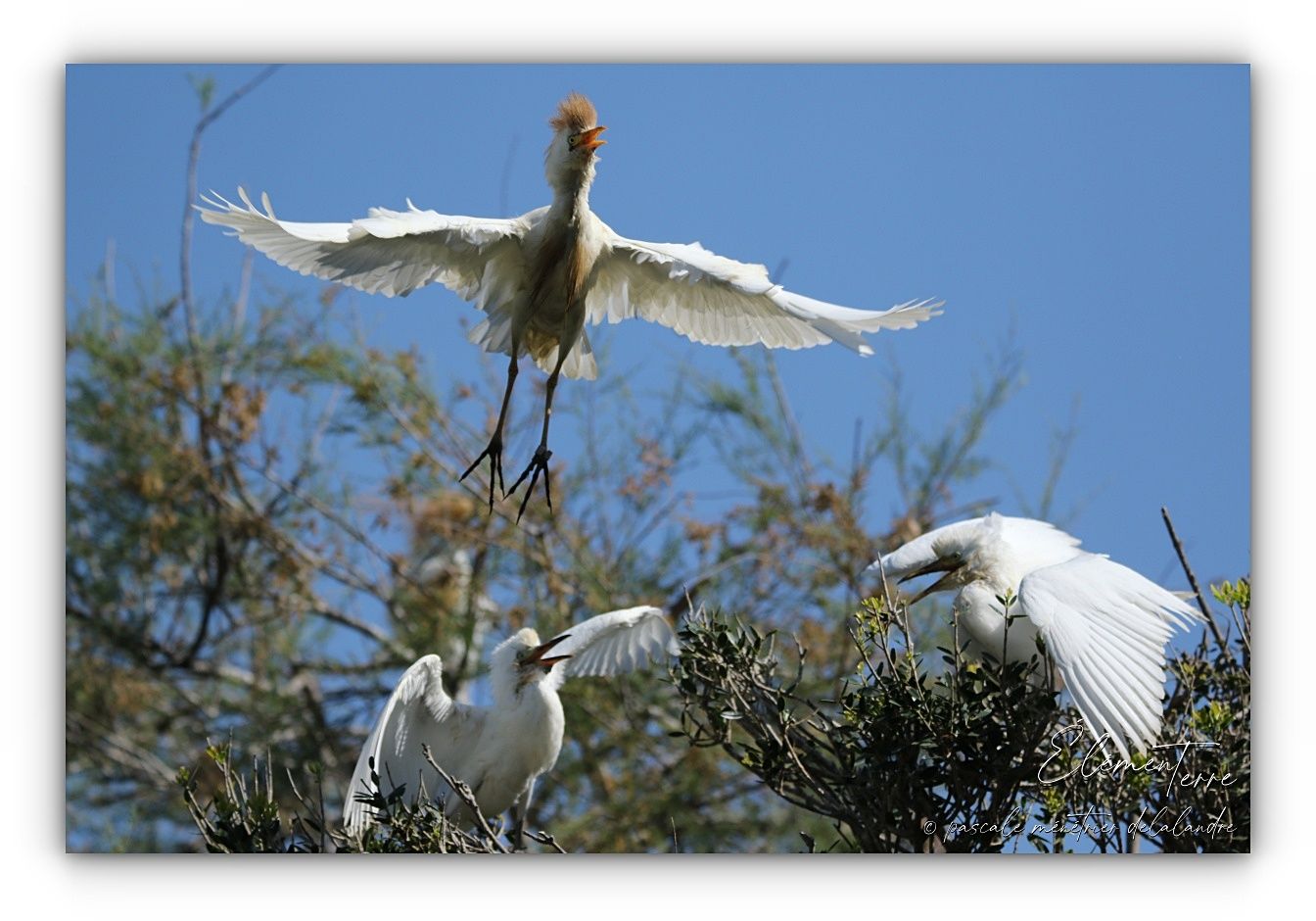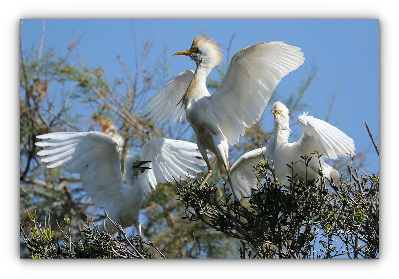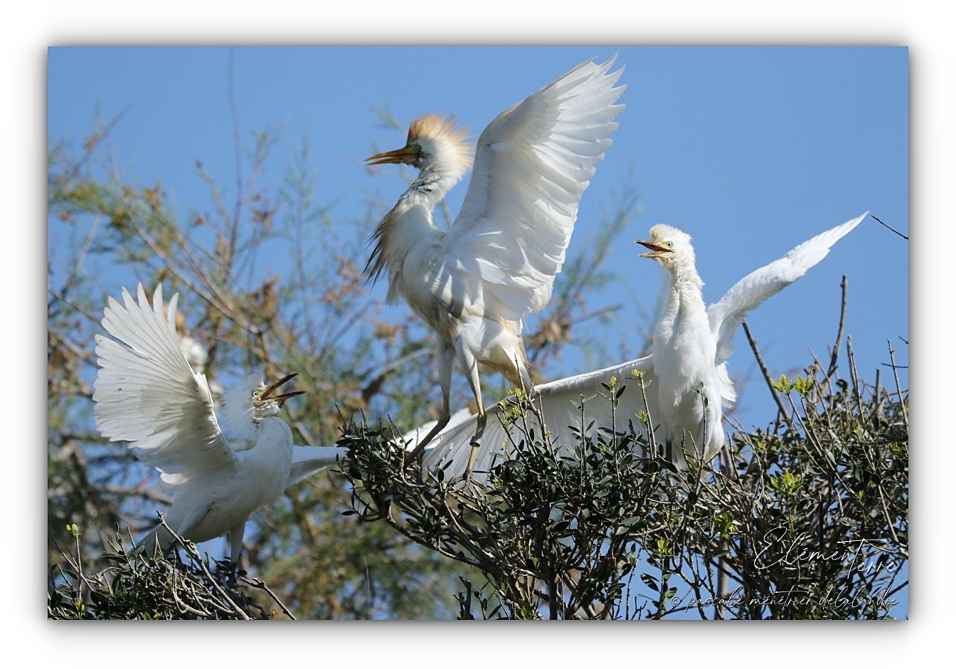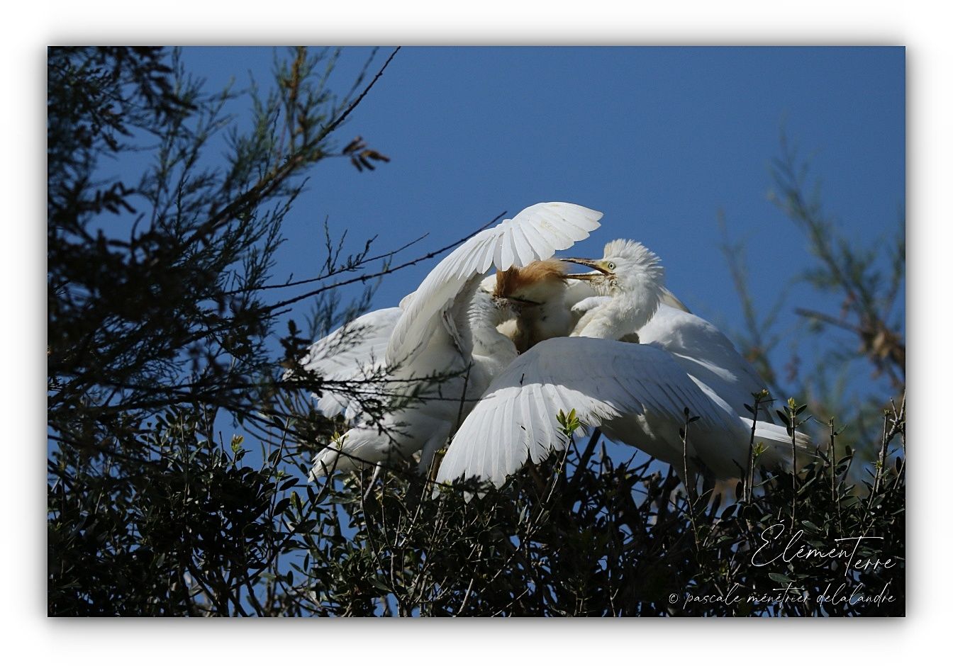 Séquences nourrissage de Hérons Garde-boeufs dans trois nids différents.