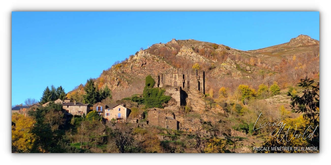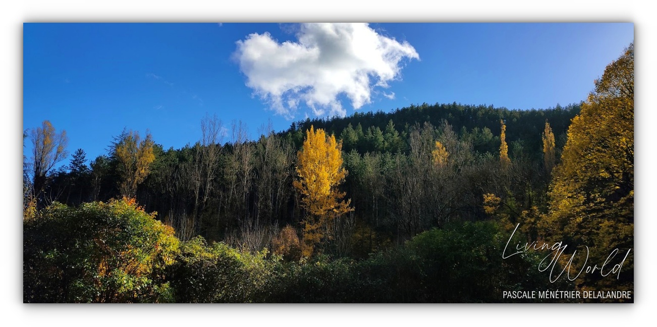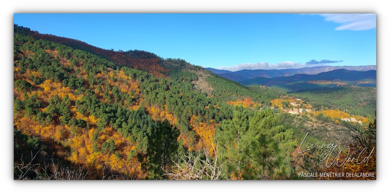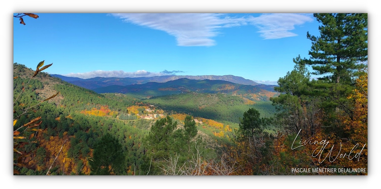 Autour de "mon" hameau (sur la droite), il y a bien sûr des épineux et des Chênes verts qui conservent leur feuillage en hiver, mais aussi des Chênes blancs, Bouleaux, Hêtres, Cèdres, fruitiers dont beaucoup de Châtaigniers (à la fois arbre fruitier et forestier)... donc de belles couleurs en automne. Au centre de la photo, sur la ligne d'horizon, le Mont-Lozère qui forme une petite pointe.